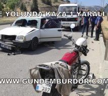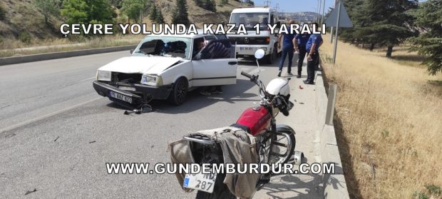 Burdur-Ankara Karayolu Sanayi Sitesi kavşağında meydana gelen kazada Burdur’dan Ankara istikametine gitmekte olan Necmettin Ö. (31) yönetimindeki 15 AAZ 623 Plakalı otomobil aynı yönde giden Osman U. (71) yönetimindeki 15 ND 287 plakalı motosiklete çarptı. Kazada yaralanan motosiklet sürücüsü ambulansla Burdur Devlet Hastanesi’ne götürülerek tedaviye alındı.