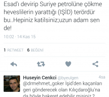 Mehmet Göker açıklamasında; “Esad’ı devirip Suriye petrolüne çökme heveslilerin yarattığı (IŞİD) terördür bu..Hepiniz katilsiniz;uzun adam sen de!” demektedir.Mehmet Göker’in bu açıklaması ile hukuken Cumhurbaşkanımıza “katilsiniz” demek suretiyle alenen hakaret ettiğinde kuşku yoktur.”