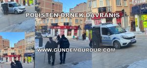 Burdur’da Gazi Caddesi üzerinde bulunan bir banka şubesine emekli maaşını çekmek için gelen yaşlı vatandaşın aşırı soğuk havada yürümekte zorlandığını gören Burdur Emniyet Müdürlüğü’ne bağlı Şehit Kemal Sunar Polis Merkezinin resmi ekip otosunda görevli bir polis memuru yaşlı vatandaşın elinden tutarak ekip arabasına bindirdi ve vatandaş ekip otosuyla evine bırakıldı. Polisin bu davranışı vatandaşların takdirini kazandı.
