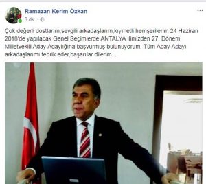 Cumhuriyet Halk Partisi’nden 22, 23 ve 24’üncü dönemlerde Burdur Milletvekilliği yapan Ramazan Kerim Özkan 24 Haziran’da yapılacak 27’inci dönem Milletvekili seçimlerinde Cumhuriyet Halk Partisi’nden Antalya milletvekili aday adayı oldu. Özkan, durumu Facebook hesabından açıkladı.