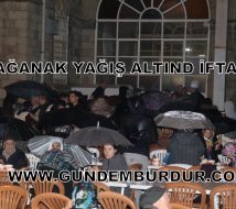 Müstakil Sanayici ve İşadamları Derneği Burdur Şubesi’nin Ulu Cami avlusunda yaklaşık 1500 kişilik iftar yemeği organize etti. Sağanak yağmur altında düzenlenen iftar yemeğini vatandaşlar ellerinde şemsiyeleri ile katıldı.