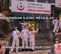 Bir Sağlık çalışanının giydiği kıyafetin üzerinde Burdur şivesi ile ‘2020 de bi git gali’ diye yazdı. Bir başka çalışan ise 2021’e ‘edebinle gel’ mesajı verdi.