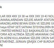 Şimşek açıklamasında ; “Değerli Burdurlular, değişik telefon numaralarından sizleri arayıp Atatürk Platformu adına aradıklarını beyan eden ve sizlere ücretli olarak ajanda ve/veya kitap seti satmak isteyenlerin Burdur Cumhuriyet Halk Partisi Merkez İlçe Başkanlığı ile hiç bir ilgisi yoktur. Platform adı altında sizleri arayarak CHP Burdur örgütünün adını kullanarak sizlere ürün satmak isteyenlere
