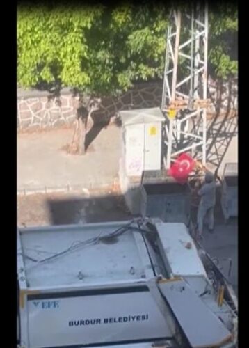 Burdur Belediyesi Temizlik İşleri Müdürlüğü’nde çalışan Ogün Zengin, arkadaşları ile birlikte Burç Mahallesi Şehit Kalmaz Caddesi’ndeki çöp konteynerini boşaltmak isterken konteynere atılan bayrağı gördü. Zengin, konteynerden aldığı bayrağı aydınlatma direğine astı.
