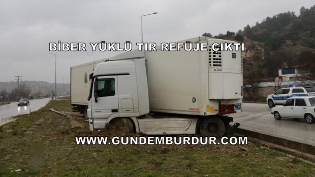 Antalya’dan yüklediği biberleri Hırvatistan’a götüren Egemen Çam yönetimindeki 31 HT 385 Plakalı Tır Antalya-Burdur Karayolu Kurna rampalarında yağmur nedeniyle kayganlaşan yolda sürücüsünün direksiyon hakimiyetini kaybetmesi sonucu kayarak aydınlatma direğine çarparak refüje çıktı.