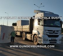 Dün akşam üzeri 18.30 sıralarında Burdur Merkez Kocapınar Köyü’ndeki Mermer Ocağından Antalya’daki Mermer Fabrikasına blok mermer götüren Bayram Yakut yönetimindeki 07 AJF 842 Plakalı TIR’ın dorsesindeki mermer blok Burdur-Antalya Karayolu Büğdüz Kavşağı’nda önünde gitmekte olan otomobilin aniden manevra yapması nedeniyle şoför frene basınca dorseden kayarak ana yola düştü. O sırada yolda herhangi bir taşıtın olmaması olası bir faciayı önledi.