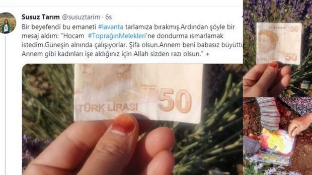 Onur paylaşımında; “Bir beyefendi bu emaneti lavanta tarlamıza bırakmış. Ardından şöyle bir mesaj aldım: “Hocam Toprağın Melekleri’ne dondurma ısmarlamak istedim. Güneşin alnında çalışıyorlar. Şifa olsun. Annem beni babasız büyüttü. Annem gibi kadınları işe aldığınız için Allah sizden razı olsun.”