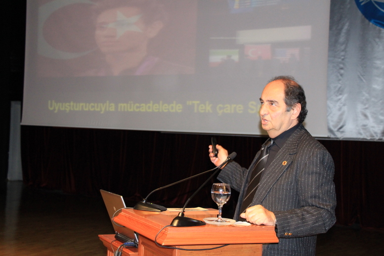 Saygı duruşu ve İstiklal Marşının okunmasıyla başlayan konferans Dünya Uyuşturucuyla Mücadele Eden Sporcular Federasyonu Başkanı Kaya Muzaffer Ilıcak’ın konuşmasıyla devam etti. Ilıcak, konuşmasında Uyuşturucuyla Mücadele Eden Sporcular Federasyonunun yürüttüğü çalışmalar ve düzenlediği etkinlikler hakkında bilgiler verdi. Ilıcak, ayrıca madde bağımlılığının ne olduğu, insanlar üzerindeki etkileri ve ülkemizde madde bağımlılığının geldiği son nokta hakkında bilgiler verirken, günümüzde madde bağımlılığı yaşının çocuk yaşlara kadar düştüğünü belirtti. Ilıcak; Uyuşturucuya başlamada etkili olan faktörleri, narkotik maddeler olarak adlandırılan uyuşturucu maddelerin ve bu maddelerin insan vücuduna etkilerinin neler olduğunu vurgularken Uyuşturucuyla mücadelede etkin rol oynayan başarılı sporcularımızdan örnekler sundu.