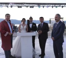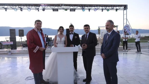 Burdur Belediye Başkanı Ali Orkun Ercengiz’in kıydığı nikah sonunda Nikah Cüzdanını Ayça Er’e veren Vali Arslantaş, gelin ve damadın ailelerini tebrik etti.