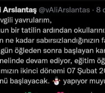 Vali Arslantaş mesajında şunları yazdı. Sevgili yavrularım, Uzun bir tatilin ardından okullarınıza dönmek için ne kadar sabırsızlandığınızın farkındayız. Bugün öğleden sonra başlayan kar yağışı ilimiz genelinde devam ediyor, eğitim öğretim yılımızın ikinci dönemi 07 Şubat 2023 Salı günü başlayacak. yapıyor muyuz?