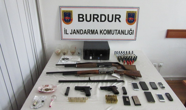urdur İl Jandarma Komutanlığınca yapılan çalışmalar sonucunda, Burdur’un Yeşilova ilçesi Salda Köyü başta olmak üzere civar köylerde ikamet eden ve uyuşturucu madde kullanan şahıslara genellikle Denizli ilinden uyuşturucu madde temin edilmesi olaylarının araştırılması ile ilgili uyuşturucu madde kullanıldığı, temin edildiği, ticaretinin yapıldığı, silah ve mermi alım satımının yapıldığına dair elde edilen bilgiler ışığında eş zamanlı olarak, toplam 11 şüpheli şahsa ait 10 adres ve 5 araçta yapılan aramalarda 2 gram kubar esrar, 9,5 gram kenevir tohumu, 3 adet uyuşturucu madde yapımında kullanılan zıvana, 2 adet 9 mm. çapında Baretta ve Girsan marka ruhsatsız tabanca, 2 adet değişik marka ruhsatsız av tüfeği, 76 adet 9 mm. çapında tabanca fişeği, 57 adet kurusıkı tabanca fişeği, 111 adet av tüfeği fişeği, 1 adet av tüfeği namlusu, şarjörü, 3 adet dipçiği ile 1 adet muşta ele geçirildi.