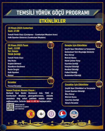 19 Nisan Cumartesi günü saat 17.00’da Çatalpınar’dan başlayacak olan temsili Yörük Göçü, Cumhuriyet Meydanı’na kadar devam edecek. Yörük yaşamının izlerini taşıyan görkemli kortejin akabinde göç duası yapılacak.